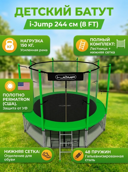 Батут с защитной сеткой i-Jump 8ft green - ДоставкаДоставка по Москве: бесплатно, 1-2 дняДоставка по Санкт-Петербургу: бесплатно, 2-3 дня Доставка по России: стоимость уточняйте у оператора. Батут с защитной сеткой i-Jump 8ft green - Отзывы0.0