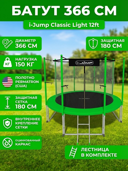 Батут с внутренней сеткой и лестницей i-Jump Classic Light 12ft green - Обзор ТОП-10 лучших батутов 2025 🏆: Обзор и рейтинг