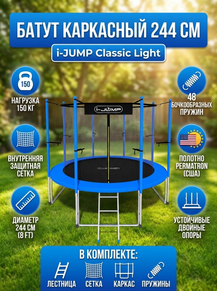 Батут с внутренней сеткой и лестницей i-Jump Classic Light 8ft blue - ОписаниеСомневаетесь? - Посмотрите рейтинг ТОП-10 по категории «Детские батуты»Батут серии Classic Light разработан в соответствии с нормами безопасности и изготовлен из высококачественных материалов. Имеет сдвоенные опоры основания, обеспечивающие хорошую устойчивость. Прыжковое полотно сделано в США из полипропиленового мата с защитой от УФ излучения. Пружины имеют бочкообразную форму для правильного распределения сопротивления металла при растяжении. Все металлические части (опоры, пружины и прочее) изготовлены из оцинкованной стали для предотвращения коррозии.