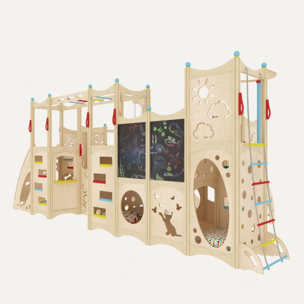 Данная конструкция не обладает мобильностью: она требует приличную площадь для установки. Но, поверьте, оно того стоит! Настоящий детский дворец с лабиринтом внутри придётся по душе маленьким капризулям. Они будут проводить в нём уйму времени, развивая координацию движений, ловкость и выносливость, смекалку, фантазию и воображение в процессе игровых игр, мелкую моторику, рисуя на грифельной доске. Игровая конструкция включает все модули, необходимые для укрепления всех групп мышц, социального развития малышей. Им даже целого дня не хватит, чтобы изучить этот сказочный игровой замок.