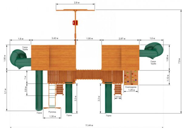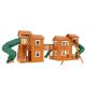 Грандиозный деревянный комплекс укомплектован несколькими домиками, соединенными между собой переходами-мостиками. Это двухуровневые башни с домиками и верандами, с пластиковыми окошками, тремя горками – волновыми разной длины и горками в виде трубы.