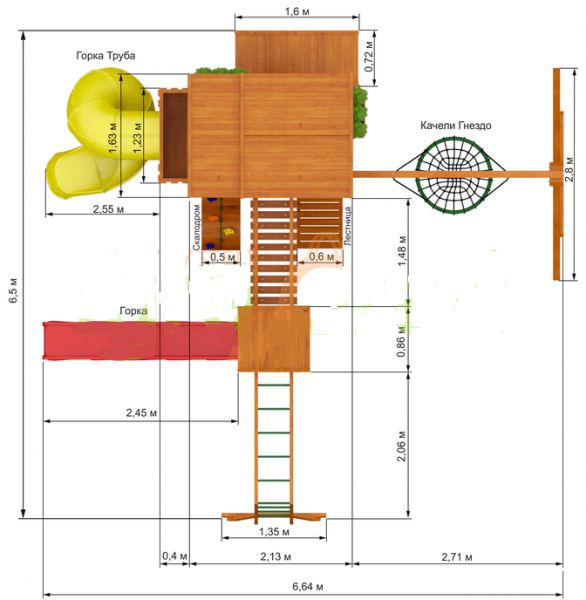 Детская площадка состоит из закрытого двухуровневого деревянного домика с дверью, крышей, балконом, увеличенным первым этажом с дополнительным домиком и отдельно стоящим дополнительным двухуровневым домиком с деревянной крышей. Это целое сказочное царство для юных исследователей и маленьких принцесс.