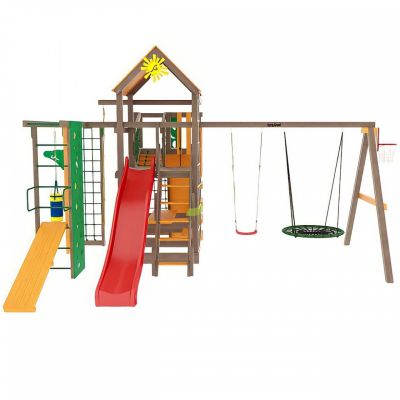 Дизайнеры разработали для детской площадки интересный дизайн, чтобы она была интересна ребятам. Деревянная двухуровневая башня с крышей со всех сторон укомплектована множеством спортивно-игровых приспособлений, обеспечивающих детям активный досуг. Попасть на эту башню можно разными способами: по верёвочной лестнице, трапу и рукоходу, канату, скалодрому, обезьяньей тропе. Это настоящие препятствия, которые впечатляют детей, преодоление которых способствует полноценному физическому развитию! Игры на детской площадке обладают многими полезными качествами: