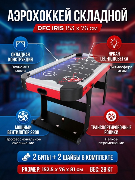 Игровой стол - аэрохоккей DFC IRIS 153 х 76 см, с подсветкой, складной - ОписаниеИгровой стол-аэрохоккей IRIS– динамика и азарт у вас дома! Погрузитесь в атмосферу настоящего аэрохоккея вместе с игровым столом.
