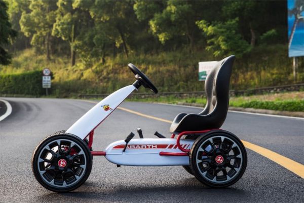 Прочная металлическая рама оснащена стильным передним спойлером. Колеса сделаны из мягкой EVA резины, что делает поездку более комфортной. Имеется режим свободного хода, чтобы педали не двигались, пока колеса двигаются или карт едет вниз по горке. Яркие наклейки с логотипом Abarth делают карт еще более интересным для окружающих. Максимальная нагрузка на карт 50 кг.