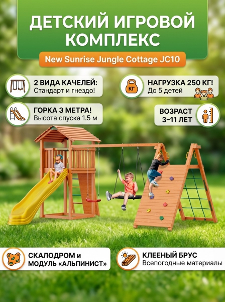 Детский игровой комплекс New Sunrise Jungle Cottage JC10 - ОписаниеСомневаетесь? - Посмотрите рейтинг ТОП-10 по категории «Детские игровые площадки»Детский игровой комплекс Jungle Cottage JC10 изготовлен из северной древесины хвойных пород, обработан безопасной декоративно-защитной пропиткой. Пропитка не содержит токсичных компонентов, экологична и абсолютно безопасна для ребёнка.