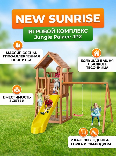 Детский игровой комплекс New Sunrise Jungle Palace JP2 - ОписаниеСомневаетесь? - Посмотрите рейтинг ТОП-10 по категории «Детские игровые площадки»Детские городки Jungle Palace + Swing X'tra от производителя New Sunrise изготавливаются из экологического материала - древесины хвойных пород (сосна). Игровая башня с балконом, безопасная пластиковая горка с высокими бортами. В основании предусмотрено место для размещения компактной песочницы. Активно провести время можно лазая по рукоходу и лесенкам, раскачиваясь на качелях (в комплекте Лодочки 2 шт). Установка конструкции производится на ровную площадку без бетонирования.