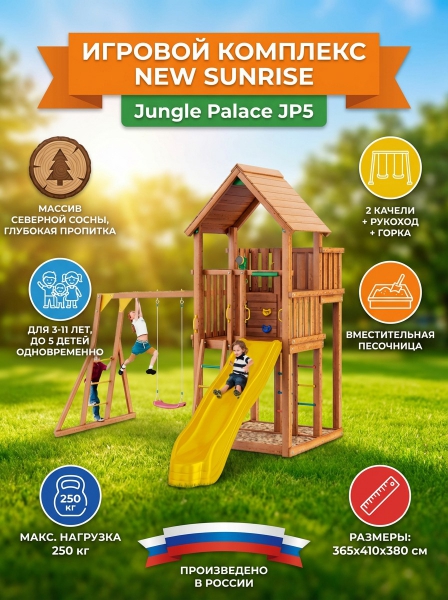 Детский игровой комплекс New Sunrise Jungle Palace JP5 - БрендСтрана бренда: Россия Страна производства: Россия Премиальность бренда:Посмотреть все детские игровые комплексы для дачи New Sunrise (40) Детский игровой комплекс New Sunrise Jungle Palace JP5 - Характеристики