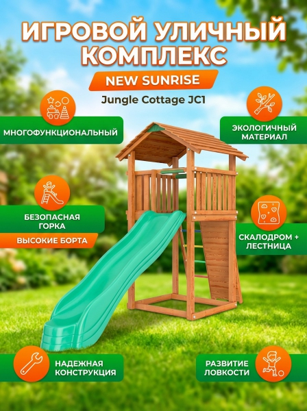 Детский комплекс с горкой и башней New Sunrise Jungle Cottage JC1 - БрендСтрана бренда: Россия Страна производства: Россия Премиальность бренда:Посмотреть все детские игровые комплексы для дачи New Sunrise (40) Детский комплекс с горкой и башней New Sunrise Jungle Cottage JC1 - Характеристики