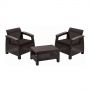 Комплект садовой мебели Keter Corfu II Weekend Set - ОписаниеКомплект садовой мебели Corfu II Weekend Set brown станет уютным уголком отдыха на загородном участке. Стильные изделия с имитацией плетения под ротанг – отличное решение при обустройстве сада. Компактный и легкий сет можно разместить в любом уголке участка и при желании быстро переместить в другое место. А благодаря прочному и устойчивому к высоким температурам материалу, изделия надолго сохранят свой насыщенный цвет.