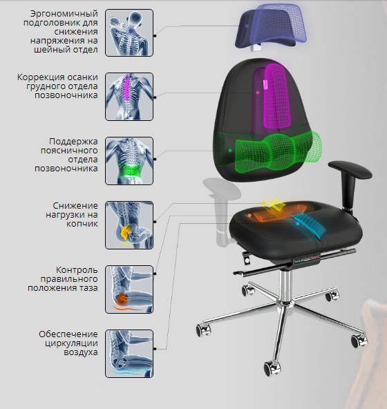 Конструкция кресла повторяет естественные анатомические контуры тела, корректирует осанку, предупреждает возникновение и развитие заболеваний позвоночника и гарантирует здоровый комфорт.