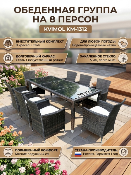 Обеденная группа на 8 персон Kvimol КМ-1312 - ДоставкаДоставка по Москве: бесплатно, 1-2 дняДоставка по Санкт-Петербургу: бесплатно, 2-3 дня Доставка по России: стоимость уточняйте у оператора. Обеденная группа на 8 персон Kvimol КМ-1312 - Отзывы0.0