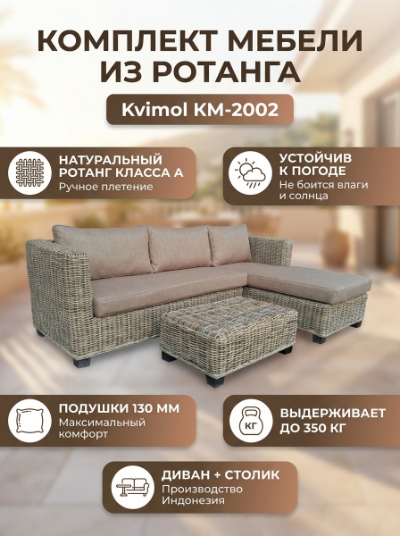 Комплект мебели для отдыха Kvimol КМ-2002 - ДоставкаДоставка по Москве: бесплатно, 1-2 дняДоставка по Санкт-Петербургу: бесплатно, 2-3 дня Доставка по России: стоимость уточняйте у оператора. Комплект мебели для отдыха Kvimol КМ-2002 - Отзывы5.0