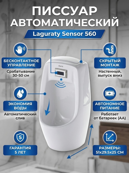Автоматический подвесной писсуар с сенсором Laguraty Sensor 560 (выпуск - вниз) - Преимущества
