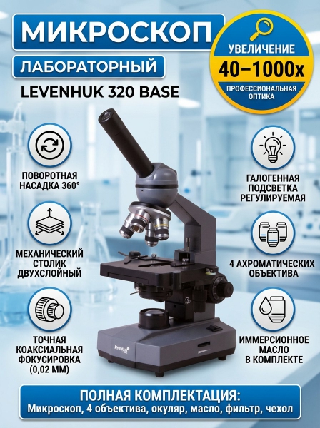 Микроскоп монокулярный Levenhuk 320 BASE - ОписаниеLevenhuk 320 BASE – это мощная лабораторная модель микроскопа для проведения микробиологических исследований разного уровня сложности в медицине, биологии и других научных областях. Это отличный выбор для научно-образовательного учреждения, оздоровительной клиники или лаборатории.