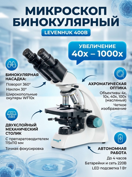 Микроскоп бинокулярный Levenhuk 400B - ОписаниеLevenhuk 400B – бинокулярный лабораторный микроскоп для работы с биологическими образцами. Этот оптический прибор создан специально для микробиологов, биохимиков, ветеринаров и медиков. Микроскоп позволяет проводить профессиональные исследования на увеличении от 40 до 1000 крат. Можно использовать метод светлого поля и масляную иммерсию.