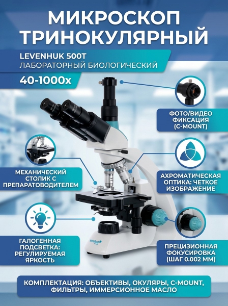 Микроскоп тринокулярный Levenhuk 500T - ОписаниеТринокулярный микроскоп 500T – это прекрасный оптический инструмент для лабораторных исследований разной степени сложности. В микроскопе используются ахроматическая оптика и галогенная подсветка, что позволяет детально и наиболее полно изучать окрашенные микропрепараты. Микроскоп найдет свое применение и в научно-исследовательском институте, и в ветеринарной лаборатории, и в медицинской клинике. Модель также подходит для оснащения кафедр высших учебных заведений и колледжей.