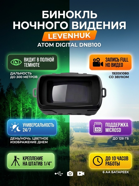 Бинокль ночного видения Levenhuk Atom Digital DNB100 - ОписаниеБинокль Levenhuk Atom Digital DNB100 – это прибор ночного видения, который защищен от засветки и подходит для использования как ночью, так и в светлое время суток. Удобно, что можно вести наблюдения обоими глазами, а для длительного изучения местности – устанавливать бинокль на штатив. Прибор станет надежным спутником на охотничьей вылазке, поможет в обеспечении безопасности лагеря в ночном походе и разведывании местности. Его достоинства высоко оценят в службах охраны, поисковых движениях и спасательных отрядах.