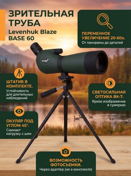 Зрительная труба Levenhuk Blaze BASE 60 - ОписаниеСо зрительной трубой Levenhuk Blaze BASE 60 вам станут доступны наблюдения даже за сильно удаленными объектами.