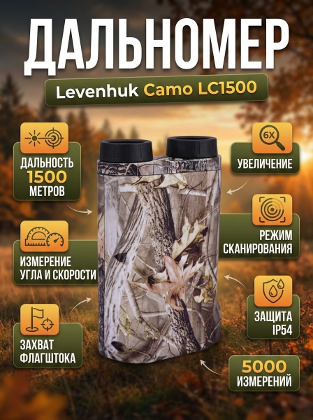 Лазерный дальномер для охоты Levenhuk Camo LC1500 - ОписаниеLevenhuk Camo LC1500 – лазерный дальномер для охоты, походов, спорта, поисково-спасательных операций и любой другой активной деятельности на открытых пространствах, которая подразумевает измерения расстояний, углов и скоростей. Прибор выполнен в камуфляжной расцветке, что оценят те пользователи, которым необходимо оставаться скрытыми во время его использования. Дальность действия прибора – до 1500 метров.