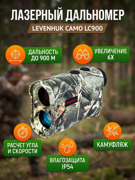 Лазерный дальномер для охоты Levenhuk Camo LC900 - БрендСтрана бренда: США Премиальность бренда:Посмотреть все оптические монокуляры для охоты и рыбалки Levenhuk (6) Лазерный дальномер для охоты Levenhuk Camo LC900 - Характеристики
