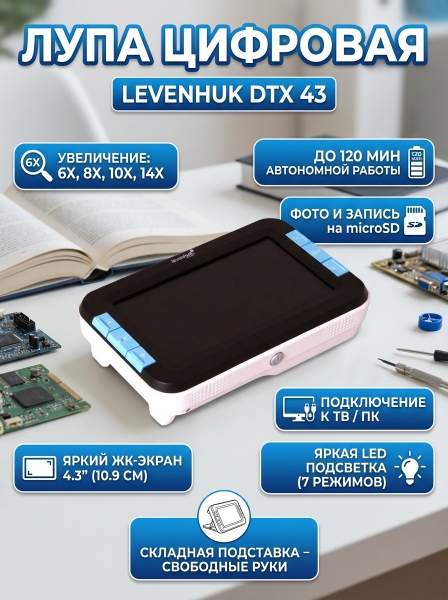 Лупа цифровая Levenhuk DTX 43 - ОписаниеЦифровая лупа Levenhuk DTX 43 станет незаменимым оптическим инструментом для тех, кто плохо видит. С ее помощью удобно читать, просматривать тексты, писать письма. Лупу можно подключить к телевизору или компьютеру и вывести на них изображение в режиме реального времени. Во время работы лупы вам будет доступна смена цветовых режимов и увеличения. Вы быстро подберете себе оптимальные параметры.
