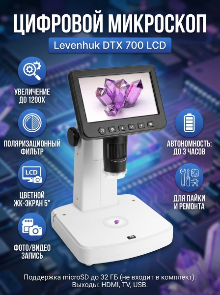 Микроскоп цифровой Levenhuk DTX 700 LCD - ОписаниеLevenhuk DTX 700 LCD предназначен для работы с монетами, минералами, шлифами металлов и другими непрозрачными объектами. Увеличение микроскопа можно плавно изменять в диапазоне от 10 до 300 крат, а при помощи цифрового зума приближение можно усилить до 1200 крат. Levenhuk DTX 700 LCD – прекрасный выбор для пайки, ремонта техники, нумизматики или научного хобби. Так как у микроскопа есть встроенный ЖК-экран, длительная работа с образцами не утомляет зрение.