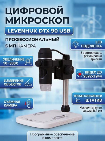 Микроскоп цифровой Levenhuk DTX 90 - ОписаниеМикроскоп Levenhuk DTX 90 – это современный профессиональный USB-микроскоп для сверхточных работ. Дает увеличение в диапазоне от 10 до 300 крат. Оснащен 5-мегапиксельной камерой. Микроскоп комплектуется специальным штативом и основанием с измерительной шкалой (8 см по оси x, 7 см по оси y) и двумя зажимами для закрепления образца под камерой.