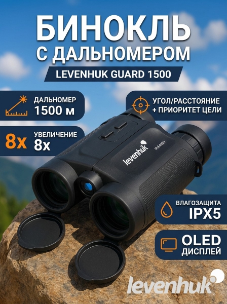 Бинокль с дальномером Levenhuk Guard 1500 - ОписаниеБинокль с дальномером Levenhuk Guard 1500 – это прибор «2 в 1», который можно использовать одновременно и для наблюдений, и для измерений на местности. Оптика обеспечивает хороший обзор и дает 8-кратное увеличение, а встроенный дальномер позволяет определять расстояния и углы на удалении до 1500 метров. Это делает Levenhuk Guard 1500 отличным выбором для охраны, охоты, спортивного ориентирования и походов.