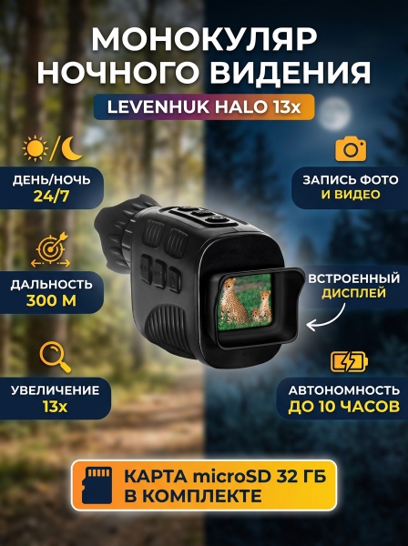 Монокуляр цифровой ночного видения Levenhuk Halo 13x - ОписаниеМонокуляр ночного видения Halo 13x снабжен цифровым преобразователем, поэтому не боится засветки и может использоваться как обычный монокуляр. Днем он показывает цветное изображение, ночью – черно-белое. Прибор станет прекрасным выбором для охоты, поможет обеспечить безопасность лагеря в походе, подойдет для тактических и спортивных игр на незнакомой местности. Благодаря встроенному рекордеру монокуляр также можно использовать для фотографирования и записи видеороликов наблюдений.