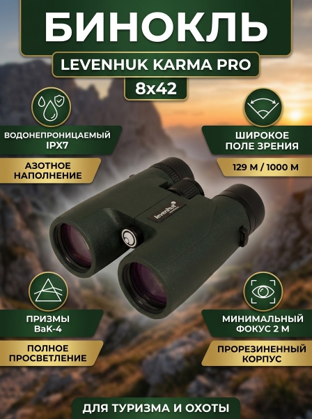 Туристический бинокль Levenhuk Karma PRO 8x42 - БрендСтрана бренда: США Премиальность бренда:Посмотреть все бинокли для туризма и путешествий Levenhuk (24) Туристический бинокль Levenhuk Karma PRO 8x42 - Характеристики