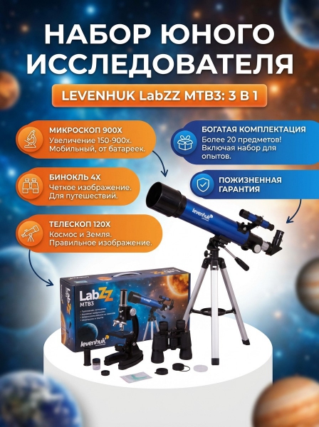 Набор Levenhuk LabZZ MTВ3 микроскоп+телескоп+бинокль - ОписаниеНабор Levenhuk LabZZ MTВ3 создан для юных исследователей, которые хотят узнать все об окружающем мире. В распоряжении юного ученого окажутся все необходимые инструменты: микроскоп – для исследования микромира, телескоп – для изучения космоса, бинокль – для наблюдений за живой природой.