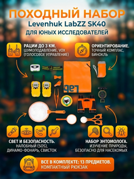 Походный набор Levenhuk LabZZ SK40 - ОписаниеLevenhuk LabZZ SK40 – походный набор для начинающего туриста или исследователя живой природы. В состав включено все, что может потребоваться ребенку в походе: бинокль и компас для ориентирования, две рации и сигнальный свисток для связи, два фонаря для перемещений в темноте – налобный и ручной динамо-фонарик. Снаряжение поможет справиться с трудностями похода и освоить базовые туристические навыки, необходимые для выживания вдали от цивилизации. Все содержимое набора компактно упаковано в удобную сумку-рюкзак.