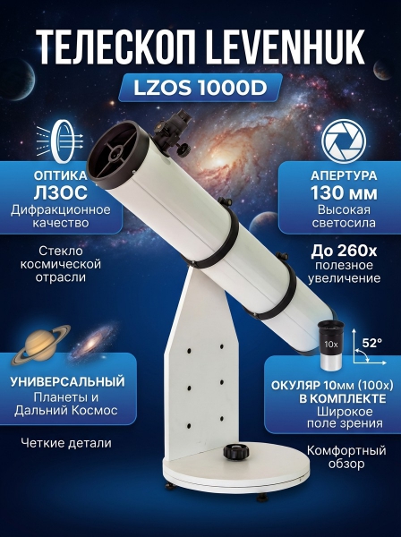Телескоп Добсона Levenhuk LZOS 1000D - ОписаниеОптика рефлектора Ньютона Levenhuk LZOS 1000D разработана с ориентиром на космическую отрасль – дифракционное качество исполнения значительно повышает и светосилу, и разрешение, позволяя наблюдать многие тусклые объекты дальнего космоса. Диаметр главного зеркала составляет 130 мм, а для управления оптической трубой используется монтировка Добсона. Телескоп позволяет детально изучать ближний космос – рассматривать Венеру, Марс, Юпитер, Сатурн и проч., а также отлично подходит для визуальных наблюдений далеких галактик, туманностей и рассеянных скоплений.