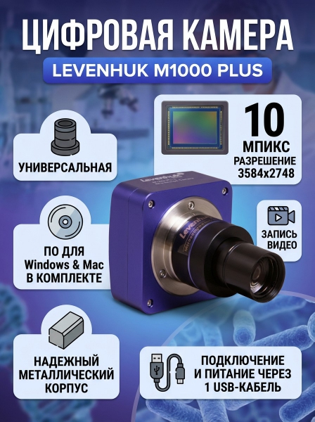 Камера цифровая Levenhuk M1000 PLUS - ОписаниеЦифровая камера Levenhuk M1000 PLUS создана специально для микроскопов и ориентирована на профессиональную работу. Камера передает очень четкое и контрастное изображение в режиме реального времени, фотографирует с разрешением до 3584x2748 пикселей и снимает видео с частотой до 27 кадров в секунду. Levenhuk M1000 PLUS – современный аксессуар для исследования микромира, который превратит ваш микроскоп в многофункциональный цифровой прибор.