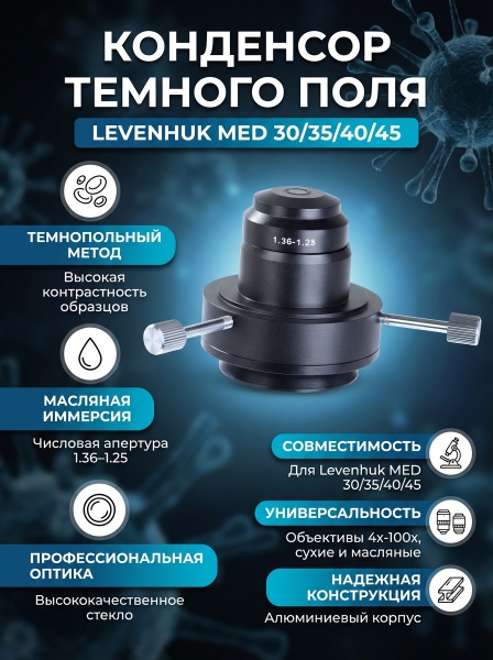 Конденсор темного поля для микроскопов Levenhuk MED 30/35/40/45 (масляный NA 1.36-1.25) - ОписаниеКонденсор темного поля – аксессуар для лабораторной микроскопии, который позволяет наблюдать образцы с использованием метода темного поля. В этом случае фон в поле зрения окуляра будет темным, а сам образец – светлым. Это позволит наблюдать то, что невозможно видеть или плохо различимо в светлом поле: неокрашенные живые образцы, в том числе «живую» кровь.