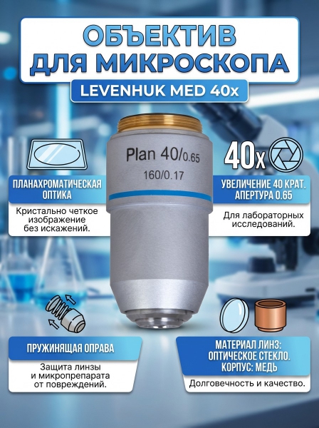 Объектив планахроматический Levenhuk MED 40x - ДоставкаДоставка по Москве: бесплатно, 1-2 дняДоставка по Санкт-Петербургу: бесплатно, 2-3 дня Доставка по России: стоимость уточняйте у оператора. Объектив планахроматический Levenhuk MED 40x - Отзывы0.0