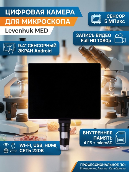 Камера цифровая для микроскопа с ЖК-экраном Levenhuk MED 5 Мпикс - ОписаниеЦифровая камера с цветным сенсорным экраном, который работает на Android. По сути – это компьютер, который показывает изображение с объектива микроскопа, позволяет записывать видеоролики, снимать фотографии и сохранять их во внутренней памяти или на внешних носителях данных. И управлять этим компьютером можно всего одним касанием. Цифровая камера Levenhuk MED – это полноценная система визуализации, делающая работу в лаборатории наиболее продуктивной. Так как ход исследований показывается прямо на экране, нет нужды постоянно смотреть в окуляры – глаза смогут отдохнуть от непрерывной работы.