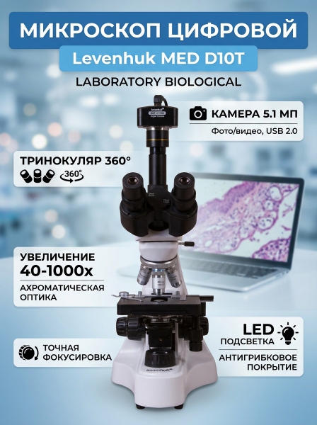 Микроскоп цифровой тринокулярный Levenhuk MED D10T - ОписаниеТринокулярный микроскоп Levenhuk MED D10T снабжен цифровой камерой 5,1 Мпикс, поэтому может использоваться не только для визуальных наблюдений, но и для проведения презентаций, и для фиксации исследований на фото и видео. Благодаря ахроматической оптике микроскоп передает контрастную и детализированную картинку. Качество изображения подходит для профессиональных исследований микробиологических образцов на увеличении от 40 до 1000 крат.