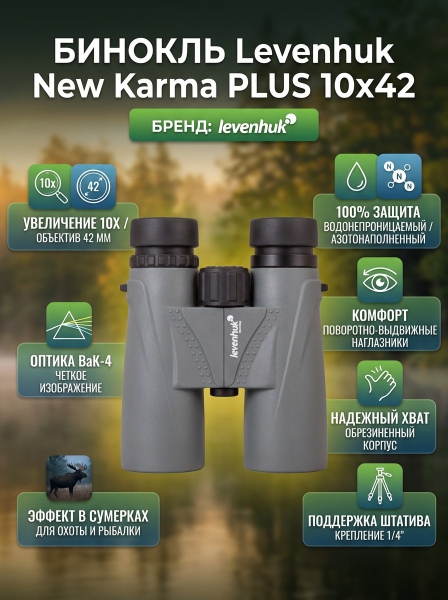 Бинокль для охоты и рыбалки Levenhuk New Karma PLUS 10x42 - ДоставкаДоставка по Москве: бесплатно, 1-2 дняДоставка по Санкт-Петербургу: бесплатно, 2-3 дня Доставка по России: стоимость уточняйте у оператора. Бинокль для охоты и рыбалки Levenhuk New Karma PLUS 10x42 - Отзывы0.0