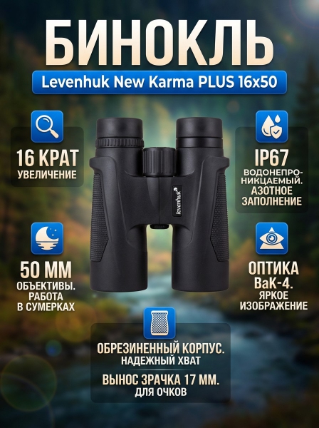 Бинокль Levenhuk New Karma PLUS 16x50 - ОписаниеБинокль Levenhuk New Karma PLUS 16x50 c мощным 16-кратным увеличением и светосильными объективами 50 мм – это надежный инструмент для работы в полевых условиях, который не боится пыли, дождя, грязи и снега, противостоит скачкам температуры и влажности окружающей среды, всегда формирует яркую, светлую, детализированную картинку. Корпус бинокля герметизирован по стандарту IP67, а значит, его работе не навредит даже кратковременное погружение в воду на глубину до 1 метра. Внутри бинокль заполнен азотом, задача которого – предотвращать выпадение конденсата на линзах. Levenhuk New Karma PLUS 16x50 – прекрасный выбор для охотников, натуралистов, охранников и спасателей.