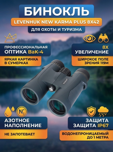 Бинокль Levenhuk New Karma PLUS 8x42 - ОписаниеБинокль Levenhuk New Karma PLUS 8x42 – отличный выбор для охоты, рыбалки, активного отдыха, походов и туризма. 8-кратное увеличение и поле зрения 6,8° позволяют с комфортом следить за удаленными статичными и подвижными объектами (включая дикую природу – животных, птиц), проводить обзорные исследования местности, невзирая на условия освещения. Благодаря многослойному просветляющему покрытию на оптических элементах, изображение, видимое наблюдателем, остается одинаково ярким, четким и светлым как при полноценном солнечном свете, так и в сумерках.