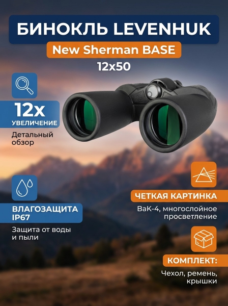Бинокль Levenhuk New Sherman BASE 12x50 - БрендСтрана бренда: США Премиальность бренда:Бинокль Levenhuk New Sherman BASE 12x50 - Характеристики