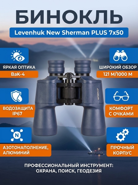 Бинокль Levenhuk New Sherman PLUS 7x50 - ОписаниеБинокль New Sherman PLUS 7x50 прекрасно подойдет для решения профессиональных задач, таких как охрана, поисковые и спасательные операции, а также работы в геодезии. Он также станет отличным выбором для любителей активного отдыха, охотников, туристов и всех, кто увлекается экстремальными видами спорта или исследованием природы. Благодаря объективам с апертурой 50 мм и многослойному просветляющему покрытию на линзах и призмах, этот бинокль способен обеспечивать яркое и четкое изображение даже при слабом освещении, например в сумерках. Водозащищенность устройства позволяет использовать его в самых разных погодных условиях, будь то на берегу водоема или на борту судна.