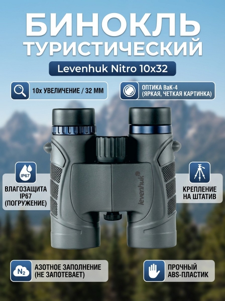 Бинокль туристический Levenhuk Nitro 10x32 - БрендСтрана бренда: США Премиальность бренда:Посмотреть все бинокли для туризма и путешествий Levenhuk (24) Бинокль туристический Levenhuk Nitro 10x32 - Характеристики