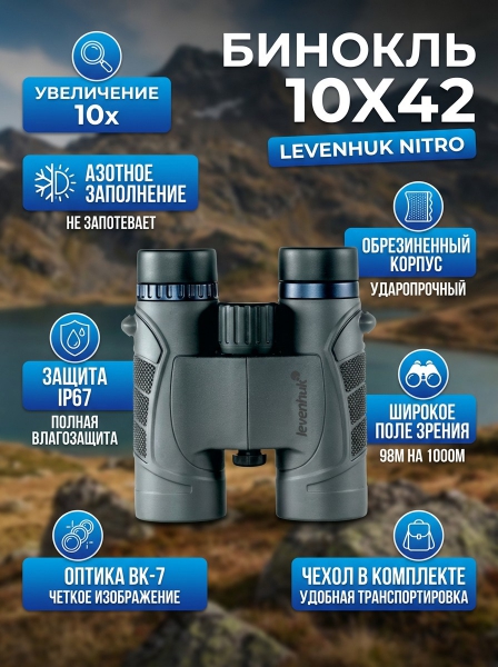 Бинокль полевой Levenhuk Nitro 10x42 - БрендСтрана бренда: США Премиальность бренда:Бинокль полевой Levenhuk Nitro 10x42 - Характеристики
