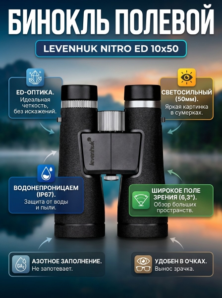 Бинокль полевой Levenhuk Nitro ED 10x50 - БрендСтрана бренда: США Премиальность бренда:Бинокль полевой Levenhuk Nitro ED 10x50 - Характеристики