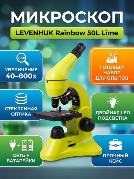 Микроскоп монокулярный Levenhuk Rainbow 50L Lime/Лайм - ОписаниеЯркий цвет сочного лайма, стильный современный дизайн, качественная оптика, высокое увеличение, эргономичная конструкция – все это микроскоп Levenhuk Rainbow 50L LimeЛайм! Прибор станет прекрасным подарком для любознательного школьника – с его помощью юный исследователь совершит множество удивительных открытий. В комплекте есть все, что нужно для знакомства с микромиром – от готовых препаратов до набора для разведения артемии.