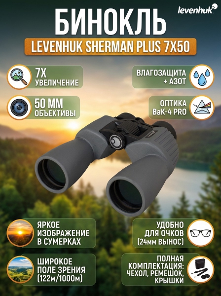 Туристический бинокль Levenhuk Sherman PLUS 7x50 - ОписаниеБинокль Levenhuk Sherman PLUS 7x50 – это превосходная просветленная оптика, классическая конструкция и эргономичный корпус.