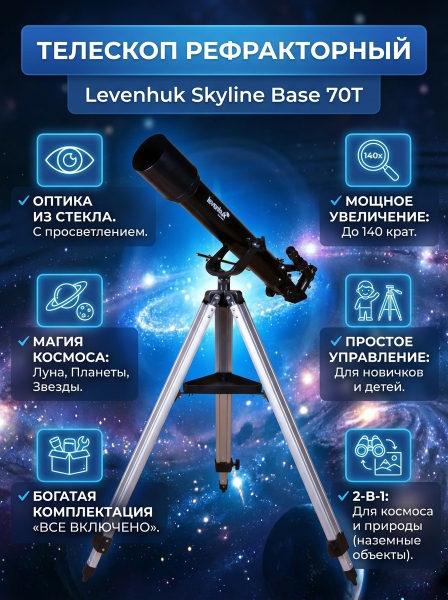 Телескоп рефракторный Levenhuk Skyline Base 70T - ОписаниеТелескоп Levenhuk Skyline BASE 70T – рефрактор для изучения наземных объектов и ближнего космоса. Он комплектуется удобной азимутальной монтировкой, устойчивой алюминиевой треногой и полным набором оптических аксессуаров. Телескоп ориентирован на начинающих пользователей и способен стать идеальным подарком увлеченному любителю астрономии.